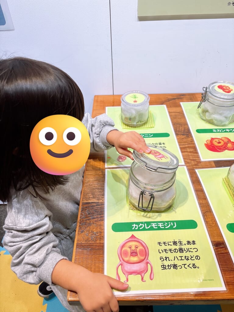 次にこびとの匂いを嗅げるエリアに行きました。最初は「ママが嗅いで」と言って近づきませんでしたが、大好きなモモジリの匂いを見つけると勇気を出してクンクンしてました。他のこびとの匂いもクンクンして次に行きました。